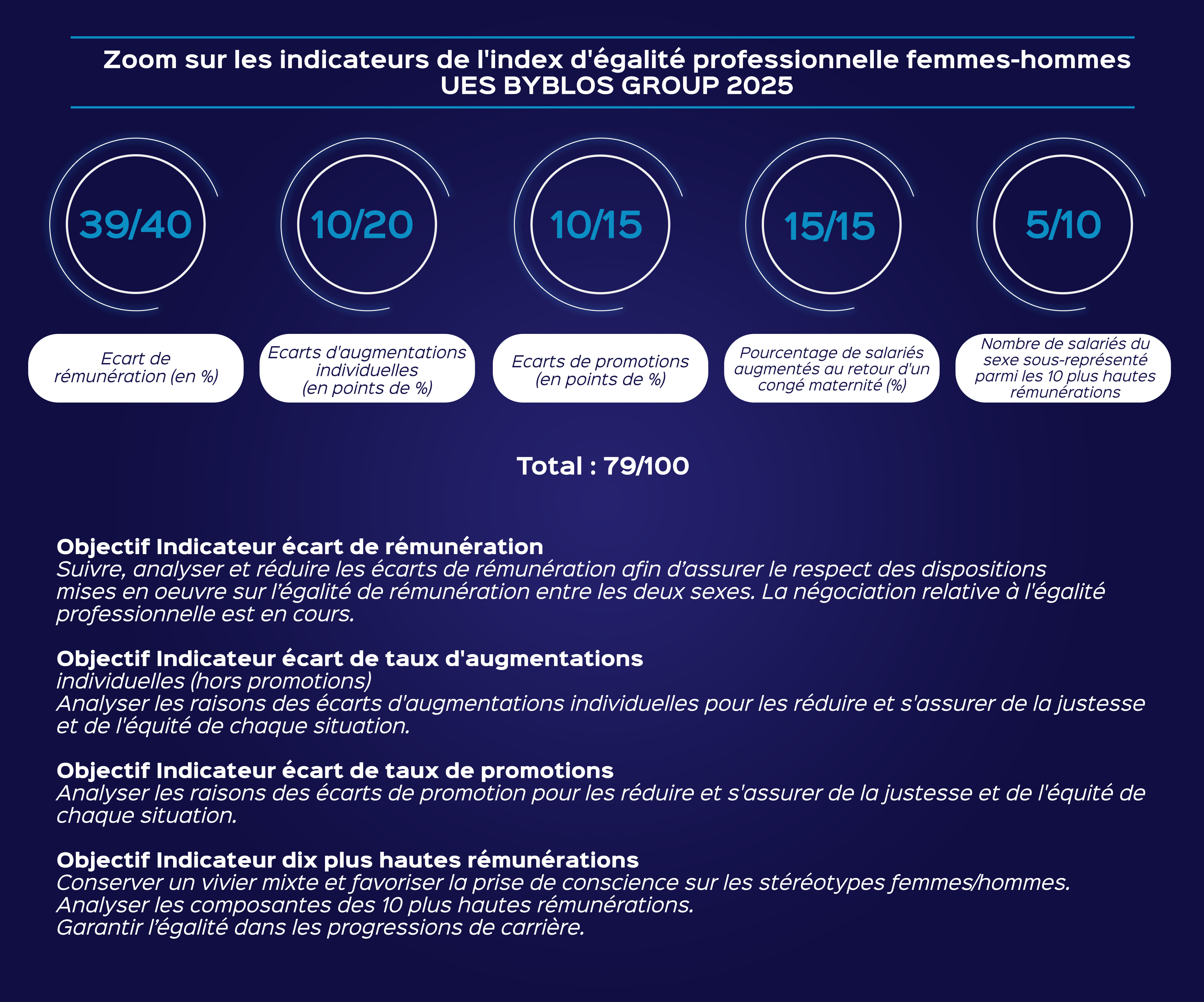 Zoom sur les indicateurs de l'index d'égalité professionnelle femmes-hommes de l'UES BYBLOS GROUP 2024 :